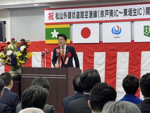 今後はさらに、インター東線の早期整備とともに、松山空港から松山港を通り国道196号に至るルートの早期事業化に向け、取り組む決意を申し上げ、お祝いとさせていただきました。