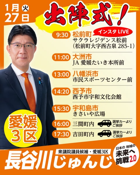 2026年01月27日(火曜日) 地元での活動 2026年1月27日(火)遊説日程・衆議院議員総選挙 1月27日(火)、いよいよ第51回衆議院議員総選挙の公示日となりました。選挙戦のスタートです‼️ 本日は、松前、大洲、八幡浜、西予、宇和島の5カ所で出陣式をおこないます。 是非、応援よろしくお願いします‼️ #長谷川じゅんじ #愛媛3区 #衆議院選挙2026 #衆議院選挙 前の記事 記事一覧 次の記事 SNS SNSでも活動情報を発信しています。ぜひフォローしてください! X@HasegawaJunji Facebookページ長谷川淳二 Facebookページhasegawa.junji.ehime Instagram@hasejun_ehime YouTubeチャンネル