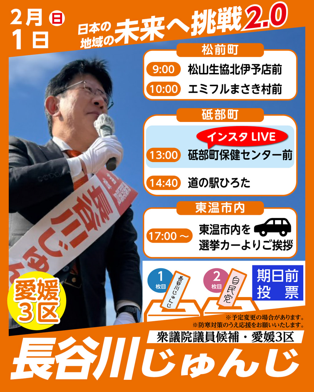 2月1日(日)の遊説日程です。松前町、砥部町、東温市にご挨拶に伺います。