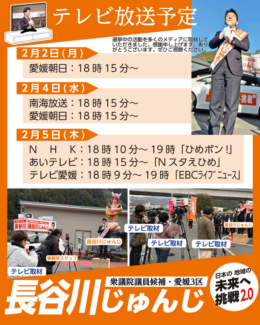2026年02月01日(日曜日) テレビ放送予定 選挙運動を多くのメディアに取材していただきました。テレビでの放送日時は次の通りです。ぜひご視聴ください。 #長谷川じゅんじ #愛媛朝日 #南海放送 #NHK #あいテレビ #テレビ愛媛 前の記事 記事一覧 SNS SNSでも活動情報を発信しています。ぜひフォローしてください! X@HasegawaJunji Facebookページ長谷川淳二 Facebookページhasegawa.junji.ehime Instagram@hasejun_ehime YouTubeチャンネル