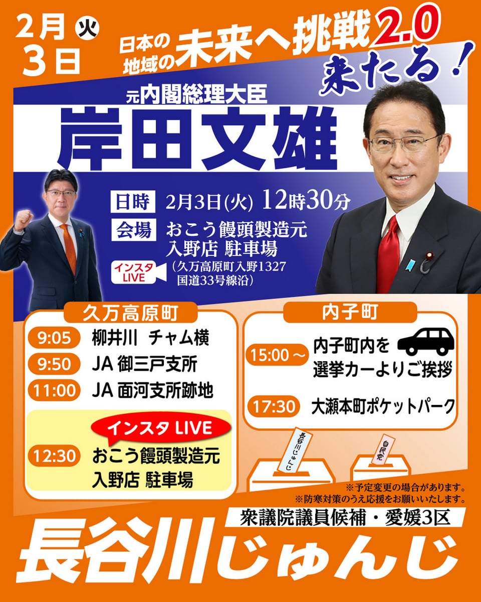 遊説日程 2月3日(火)久万高原町・内子町・岸田元総理応援演説!
